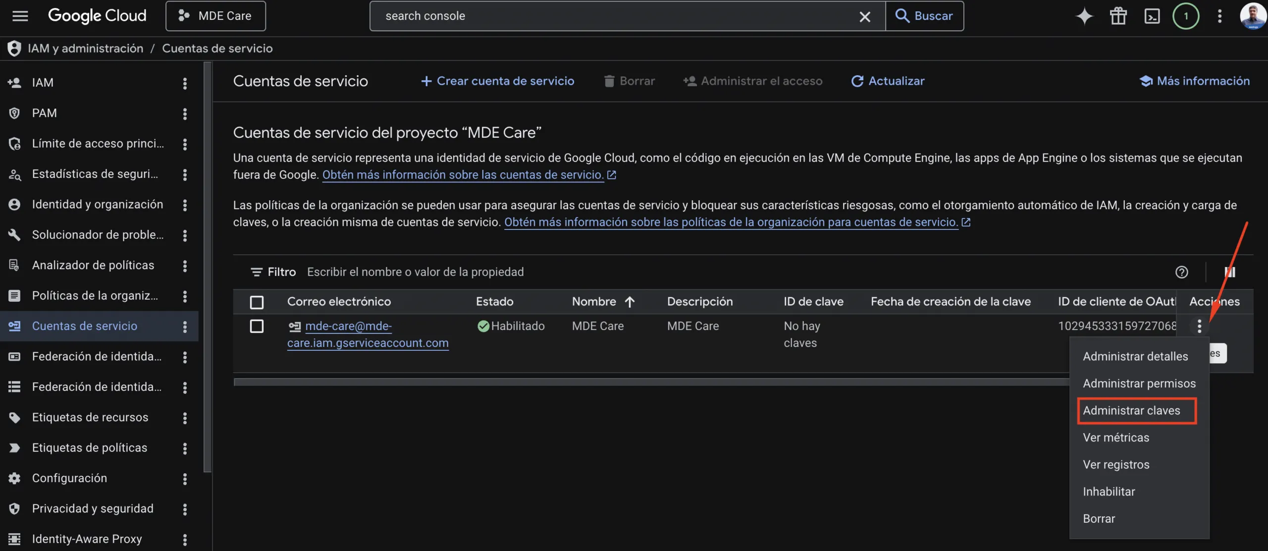 En la cuenta de servicio que acabas de crear, haz clic en el menú de los tres puntos y selecciona "Administrar claves".