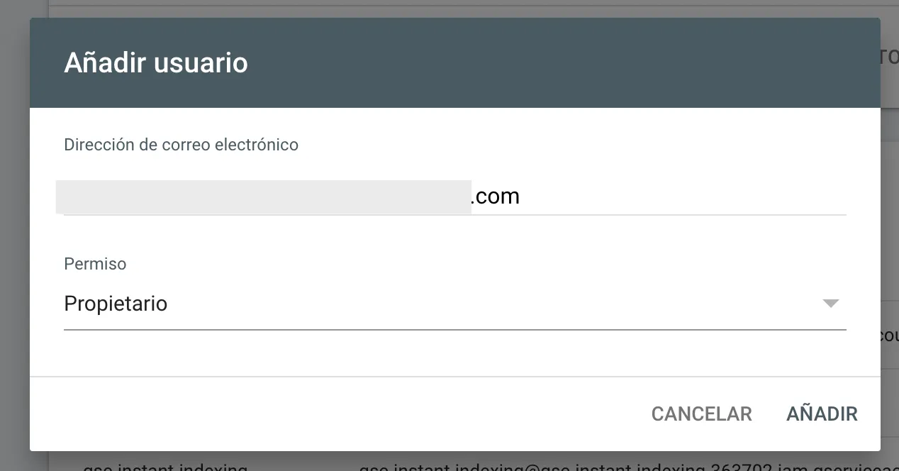 Ve a Google Search Console // Configuración // Usuarios y permisos // Añadir usuario. Pega el correo y dale permiso de Propietario.