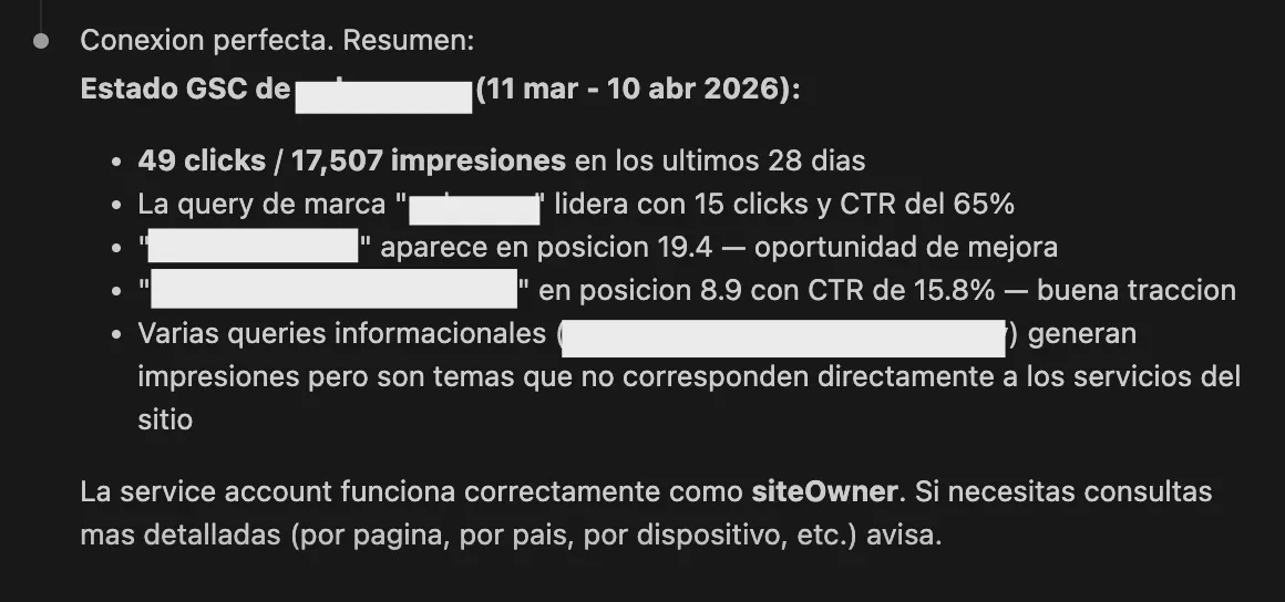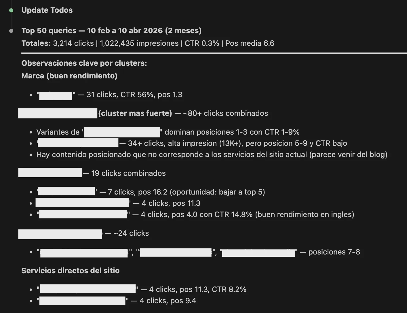 Eso es exactamente lo que puedes hacer cuando conectas GSC directamente con Claude Code. La IA accede a la API de Search Console y tú le pides lo que necesitas como si estuvieras hablando con un analista SEO que tiene todos tus datos enfrente.