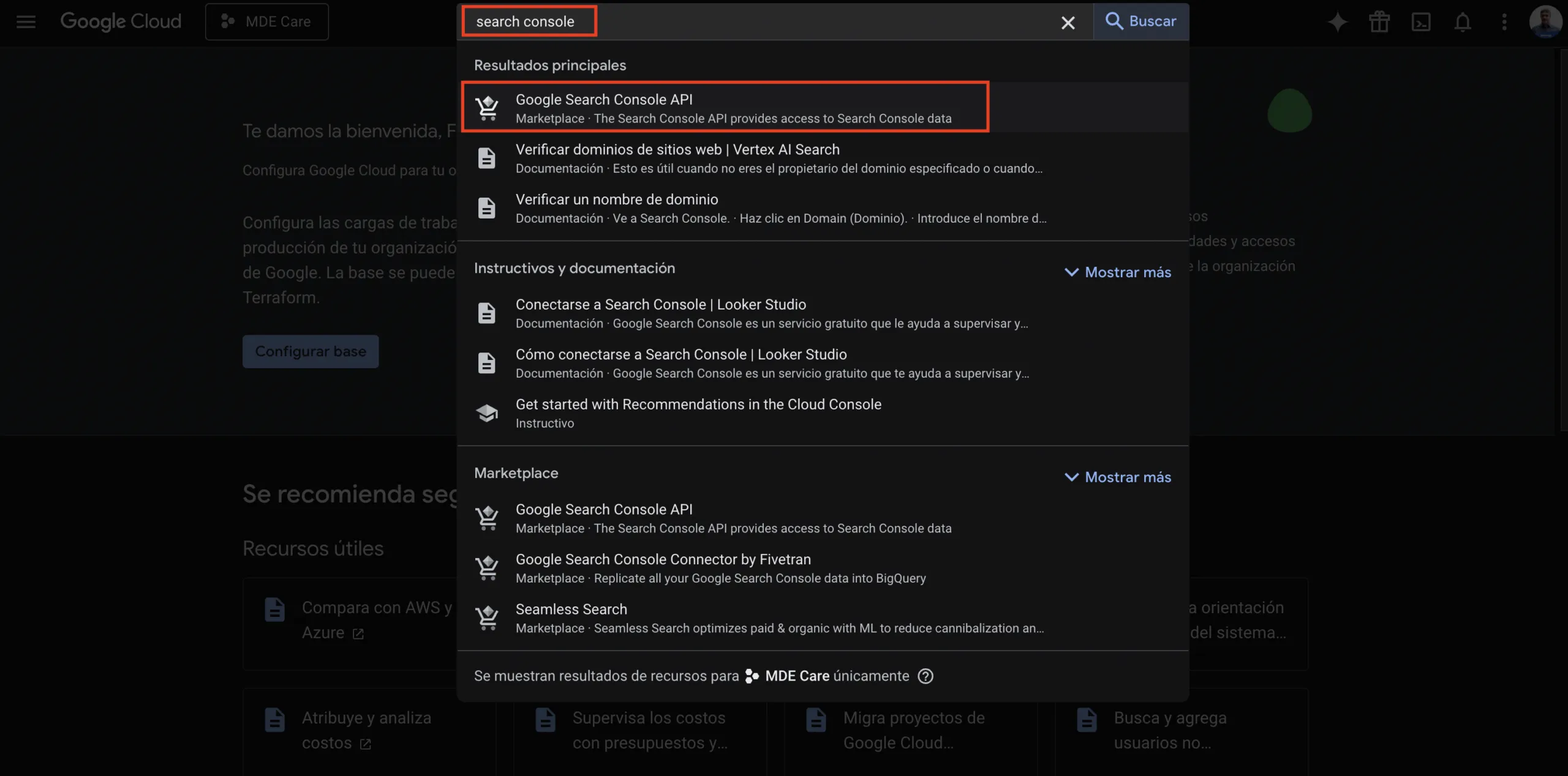 En el buscador de Google Cloud, escribe "Search Console" y selecciona Google Search Console API.