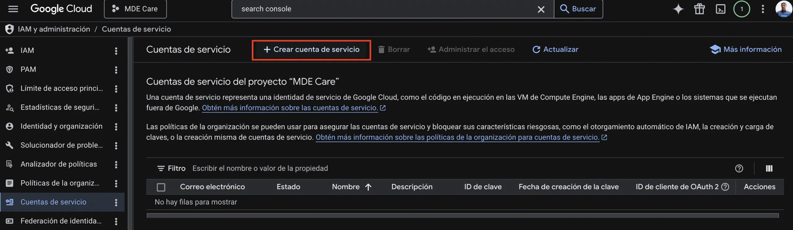 En el menú lateral izquierdo, ve a Credenciales y luego a "Administrar cuentas de servicio". Haz clic en "Crear cuenta de servicio".